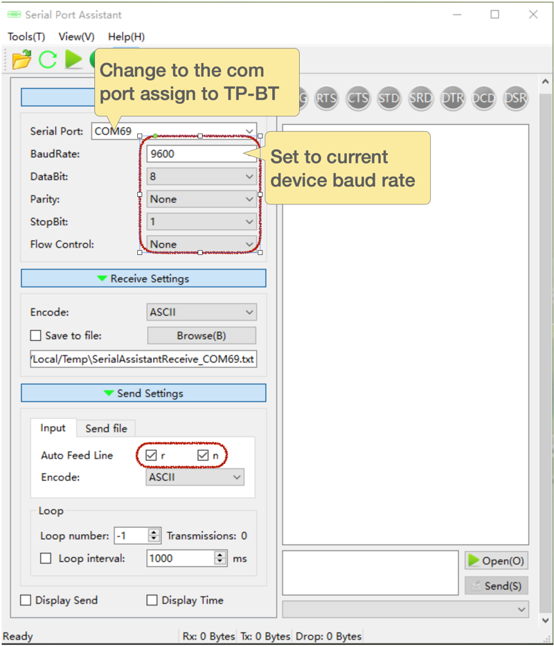 Download a comport communication software. Serial Port Assistant is the one our R&D team uses it for daily basics. You can also try Serial Debug Assistant from Microsoft Store. Connect TP-BT Bluetooth Optical Probe with your computer, write down the comport assigned to device.